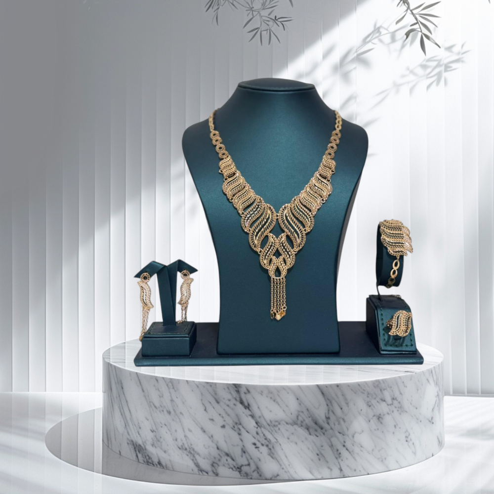 حين تمتزج الأنوثة بالفخامة، يولد السحر مع طقم بديل الذهب كامل بتصميم الفخامة فهو أكثر من مجرد إكسسوار، إنه لمسة تهمس بأناقتكِ، وتبرز ذوقكِ الرفيع في كل لحظة، تصميم أنيق يلتقط الضوء في كل حركة، وتفاصيل راقية تضفي عليكِ تألقًا لا ينسى، يتكون الطقم من خاتم، وسلسلة، وحلق متناسقة، مرصعة بأحجار براقة تأسر العين وتكمّل حضوركِ الأخاذ